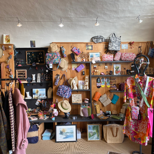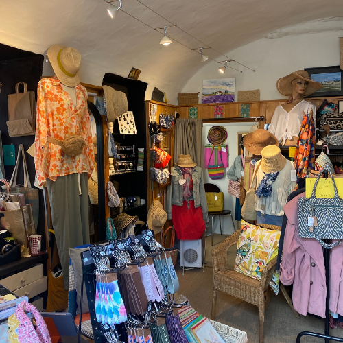 Vous trouverez une sélection de vêtements, sacs, bijoux et accessoires féminins choisis avec soin, ainsi que des aquarelles faites main à découvrir sur place.